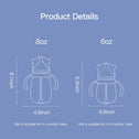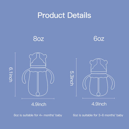 • CAPACITY: 6 ounce with 2 medium flow(3 cuts) pacifiers is suitable for babies over 3 months. 8 ounce with 2 fast flow(5 cuts) pacifiers is suitable for babies over 6 months.