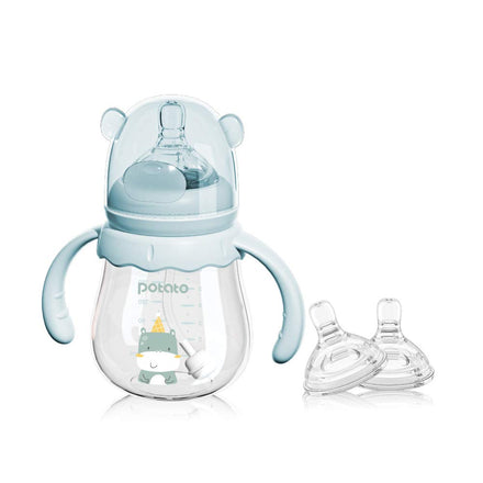 POTATO Glass Baby Bottles, Anti-Colic Breastfeeding Bottles with Medium Flow Nipple, Suitable for Babies 3-6 Months, 2 Replaceable Nipples, 6 oz, Blue