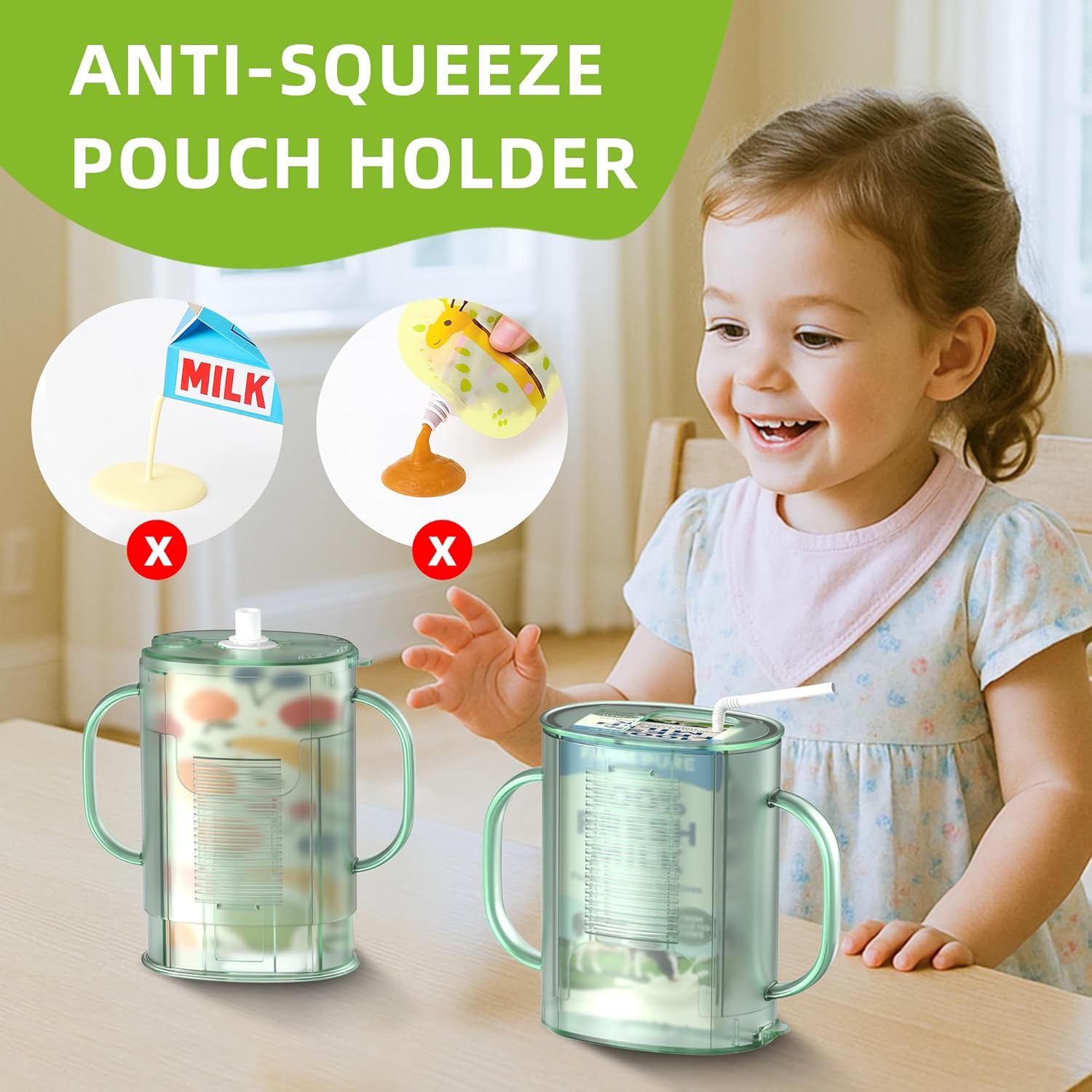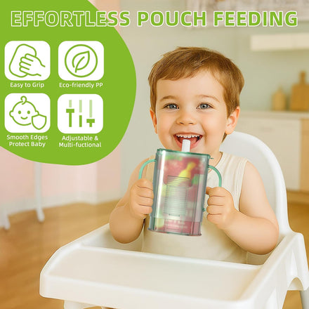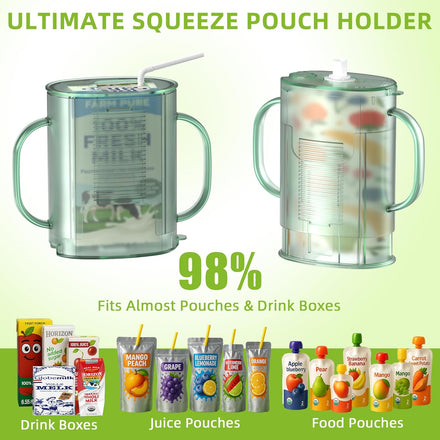 Pouch Holder No Squeeze for Food Pouches & Drink Boxes, Adjustable Baby Pouch Holder With Larger Capacity Allows Toddlers Self-Feed Avoid Mess (GREEN)