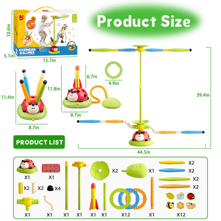 • 【New Upgrade Cute 5 in 1 3 in 1 Ladybug Exercise Jump & Toss Toy】Our cute ladybird kids toys for girls boys can transform into 5 different kids games. Game 1: Spinning Pole-Hopping Game, skip it for kids jumping. It can transforms to Game 2 : Spinning Tossing Ring Game, and transforms to Game 3: Rocket Launcher toy for foot stomp. Game 4: Obstacle Avoidance Game. Game 5: Jump Squat Challenge. Easy assembly sports and outdoors toys, 3 AA batteries required(Battery NOT Included) Ideal toys for ages 5-7 toys for ages 8-13
