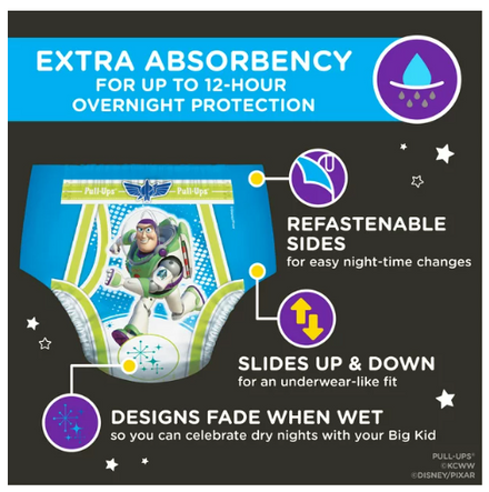 Make nighttime potty training easy with Pull-Ups Night-Time Training Pants. Pull-Ups Night-Time Training Pants are the only disposable training underwear designed specifically for nighttime and absorbs more than diapers* for up to 12 hours of overnight protection for your little boy. The easy-open sides are refastenable; so you can keep clothing on your toddler for quick changes in the middle of the night. They also promote Big Kid independence with all-around coverage and soft; stretchy sides that fit like underwear and slide up and down. The graphics feature unique Disney·Pixar designs of Buzz Lightyear from Toy Story; which fade when wet to help your little one learn and celebrate dry nights. No matter where your child is in his potty training journey; the Pull-Ups brand can help. Visit pull-ups.com for expert articles; tips and potty training resources. We've helped train 60 million Big Kids and counting! Pull-Ups Night-Time Boys' Training Pants are available in sizes 2T-3T (16-34 lbs) and 3T-4T (32-40 lbs). Buy in bulk and save.*vs. size 3-5 Huggies Little Movers diapers