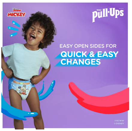 Pull-Ups Training Pants help make potty training Fun; Fast and Easy! Pull-Ups provide outstanding protection & all-around coverage with soft stretchy sides that fit like underwear. These training pants feature easy open sides for quick and easy changes; allowing you to keep pants and shoes on your toddler. Plus the adjustable sides let you customize your child's waistband & easily check for messes! Promote independence with training underwear that are easy to slide up & down; encouraging your toddler to feel like a Big Kid. Each pack includes two exclusive music designs featuring Disney's Mickey Mouse. Instrument graphics fade when wet to help motivate your child to stay dry! Tell the story of how Mickey Mouse loves making music & your child can help keep the music going! Making music with Mickey Mouse comes to life with interactive digital tools and fun extras like inside-the-box coloring mat or stickers. When your child is ready to begin his potty training journey the Pull-Ups brand can help. Visit pull-ups.com for expert potty training tips & resources. We've helped train 60 million Big Kids and counting!* Pull-Ups Boys' Training Pants are available in sizes 2T-3T (18-34 lb.); 3T-4T (32-40 lb.) and 4T-5T (38-50 lb.). (*US & CA)