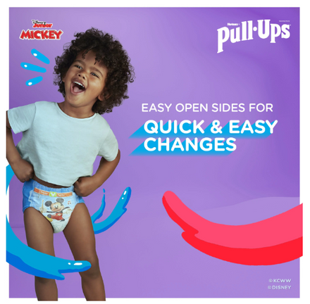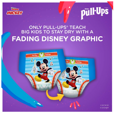 Pull-Ups Training Pants help make potty training Fun; Fast and Easy! Pull-Ups provide outstanding protection & all-around coverage with soft stretchy sides that fit like underwear. These training pants feature easy open sides for quick and easy changes; allowing you to keep pants and shoes on your toddler. Plus the adjustable sides let you customize your child's waistband & easily check for messes! Promote independence with training underwear that are easy to slide up & down; encouraging your toddler to feel like a Big Kid. Each pack includes two exclusive music designs featuring Disney's Mickey Mouse. Instrument graphics fade when wet to help motivate your child to stay dry! Tell the story of how Mickey Mouse loves making music & your child can help keep the music going! Making music with Mickey Mouse comes to life with interactive digital tools and fun extras like inside-the-box coloring mat or stickers. When your child is ready to begin his potty training journey the Pull-Ups brand can help. Visit pull-ups.com for expert potty training tips & resources. We've helped train 60 million Big Kids and counting!* Pull-Ups Boys' Training Pants are available in sizes 2T-3T (18-34 lb.); 3T-4T (32-40 lb.) and 4T-5T (38-50 lb.). (*US & CA)