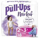 Introducing Pull-Ups New Leaf Training Pants; the softest training underwear made with plant-based ingredients* for healthy skin. Clinically proven to be hypoallergenic and made without harsh ingredients; New Leaf training pants provide up to 12 hours of outstanding leak protection. Made with a cottony-soft & breathable material with high absorbency; New Leaf training pants are designed to help keep your child comfortable while potty training. Pull-Ups New Leaf training pants also feature an underwear like design for easy up & down motion that helps promote learning and Big Kid independence. Plus soft; refastenable sides provide an adjustable waistband for a secure fit and quick changes on-the-go or at home. Featuring your favorite Frozen II characters; each pack includes front & back designs of Disney's Elsa & Anna; with wetness indicator graphics that fade when wet for a fun way to help her learn. When your child is ready to begin her potty training journey; the Pull-Ups brand can help. Visit pull-ups.com for expert articles; tips and potty training resources. We've helped potty train 60 million Big Kids and counting!** Pull-Ups New Leaf Training Pants are available in sizes 2T-3T (16-34 lb.); 3T-4T (32-40 lb.) and 4T-5T (38-50 lb.). (*28% by weight). (**US and Canada)