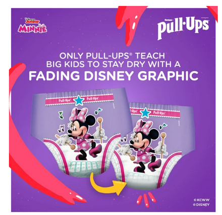 Pull-Ups Training Pants help make potty training Fun; Fast and Easy! Pull-Ups provide outstanding protection & all-around coverage with soft stretchy sides that fit like underwear. These training pants feature easy open sides for quick and easy changes; allowing you to keep pants and shoes on your toddler. Plus the adjustable sides let you customize your child's waistband & easily check for messes! Promote independence with training underwear that are easy to slide up & down; encouraging your toddler to feel like a Big Kid. Each pack includes two exclusive music designs featuring Disney's Minnie Mouse. Instrument graphics fade when wet to help motivate your child to stay dry! Tell the story of how Minnie Mouse loves making music & your child can help keep the music going! Making music with Minnie Mouse comes to life with interactive digital tools and fun extras like inside-the-box coloring mat or stickers. When your child is ready to begin her potty training journey the Pull-Ups brand can help. Visit pull-ups.com for expert potty training tips & resources. We've helped train 60 million Big Kids and counting!* Pull-Ups Girls' Training Pants are available in sizes 2T-3T (18-34 lb.); 3T-4T (32-40 lb.) and 4T-5T (38-50 lb.). (*US & CA)