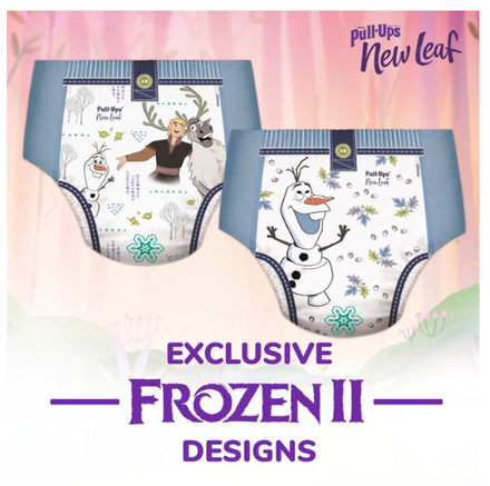 Introducing Pull-Ups New Leaf Training Pants; the softest training underwear made with plant-based ingredients for healthy skin. Clinically proven to be hypoallergenic and made without harsh ingredients; New Leaf training pants provide up to 12 hours of outstanding leak protection. Made with a cottony-soft & breathable material with high absorbency; New Leaf training pants are designed to help keep your child comfortable while potty training. Pull-Ups New Leaf training pants also feature an underwear-like design for easy up & down motion that helps promote learning and Big Kid independence. Plus soft; refastenable sides provide an adjustable waistband for a secure fit and quick changes on the go or at home. Featuring your favorite Frozen II characters; each pack includes front & back designs of Disney's Olaf; Sven & Kristoff; with wetness indicator graphics that fade when wet for a fun way to help him learn. When your child is ready to begin his potty training journey; the Pull-Ups brand can help. Visit pull-ups.com for expert articles; tips; and potty training resources. We've helped potty train 60 million Big Kids and counting. Pull-Ups New Leaf Training Pants are available in sizes 2T-3T (16-34 lb.); 3T-4T (32-40 lb.); and 4T-5T (38-50 lb.). (28% by weight).