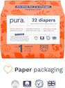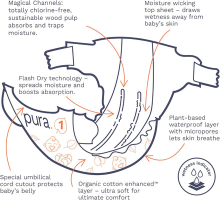 • GOOD FOR THE PLANET: Pura’s diapers are manufactured in a carbon neutral plant, powered by green electricity. Where possible, we’ve replaced non-sustainable materials with lower impact materials such as wood pulp from sustainably managed forests in the absorbent core of our diapers. Our packaging is made from paper, so it's easier to recycle!