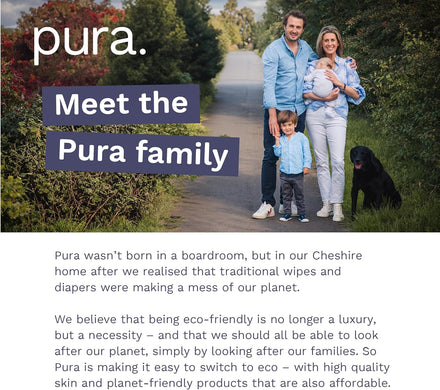 We set out to create a high performance, low environmental impact diaper that doesn’t compromise on skin safety, comfort or value for money. Approved by dermatologists to be gentle on sensitive, newborn skin, our diapers feature an umbilical cut-out to protect the delicate belly area and a handy color changing wetness indicator. Organic cotton enhanced, with plant-based materials against babies’ skin, they’re luxuriously soft and verified by Allergy UK as skin-safe as well as being sustainably made. Meet the Pura family Pura didn’t start in a boardroom. It was born in the British home of Guy and Abi Fennell. Created by parents, for parents, Pura was founded to make clean, safe and planet-friendly products affordable for all. Pura is a Carbon Neutral business and a certified B-Corp.