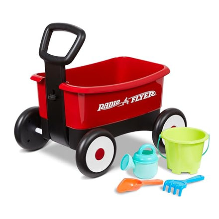 - 2 WAGONS IN 1: The handle of the My 1st 2-in-1 Wagon with Garden Tools can lock as a walker wagon or released for a pull wagon.