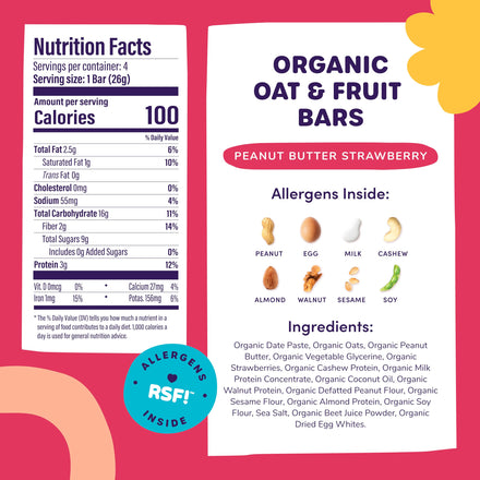 Ready Set Food Organic Oat & Fruit Bars – Safe & Easy Early Allergen Exposure for Babies 12+ Months, Organic Toddler Snacks with 8 Top Allergens, No Added Sugar (Peanut Butter Strawberry, 2-Pack)