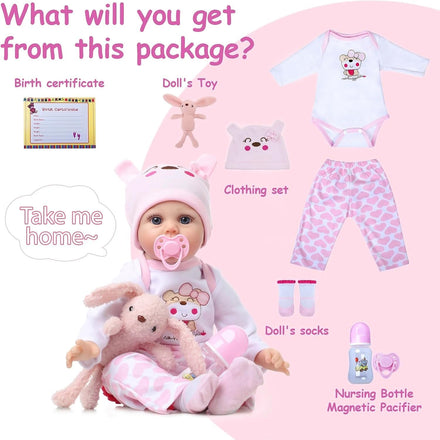 • TAKE HER HOME: You will receive reborn baby doll *1, doll costume *1, magnetic pacifier *1, bunny toy*1, birth certificate *1, feeding bottle *1, diaper *1 all in a gift box