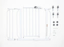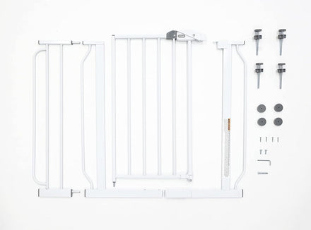 Product Description Keep your little explorers safe with the Regalo Easy Step Baby Gate, a reliable and durable safety solution designed for busy families. Crafted from sturdy all-steel construction, this extra-wide safety gate fits openings between 29 and 34 inches and 35 to 38.5 inches, standing 30 inches tall to secure doorways, hallways, and stairways. Installation is a breeze with versatile pressure mount or wall mount options, requiring no drilling for most setups. The gate features a convenient walk-through door with a one-touch safety lock lever, allowing adults to pass easily while keeping children and pets safely contained. Designed specifically for children aged 6 to 24 months, this gate is also perfect for medium to large dogs, making it a versatile barrier for your home. The 2.5-inch spacing between bars ensures safety by preventing little fingers from getting stuck, while the 16-inch wide door allows easy access. Please note: Before installation, the gate may appear bent and a gap may be visible at the handle — this is normal and will be eliminated once properly mounted. Always measure your opening prior to purchase to guarantee the right fit. The gate frame is designed to remain assembled at all times for maximum safety. Included in the package is a 6-inch extension kit, four pressure-mounted spindle rods, and four wall cups with screws to provide a secure and customizable fit for your home. Choose the Regalo Easy Step Baby Gate for a durable, easy-to-use, and trusted safety gate that protects your loved ones. Manufacturer Contact Information Regalo Customer support number : 952-435-1080 or 866-272-5274. email : service@regalo-baby.com