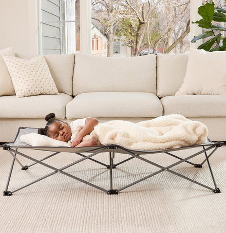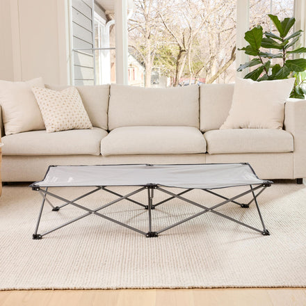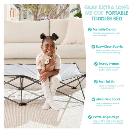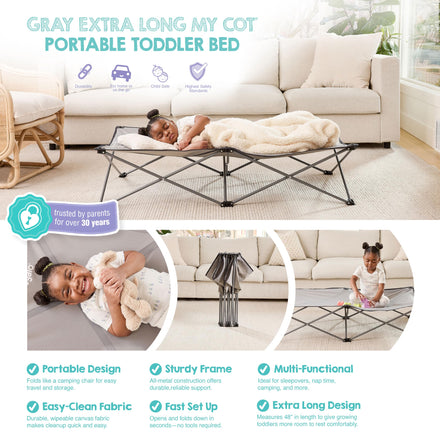 Details: The Regalo Gray Extra-Long My Cot Portable Toddler Bed is a multi-functional cot for your little one who needs a safe, comfortable place to rest. An essential item for travel, sleepovers, nap time, picnics, and camping, it was designed for portability.
