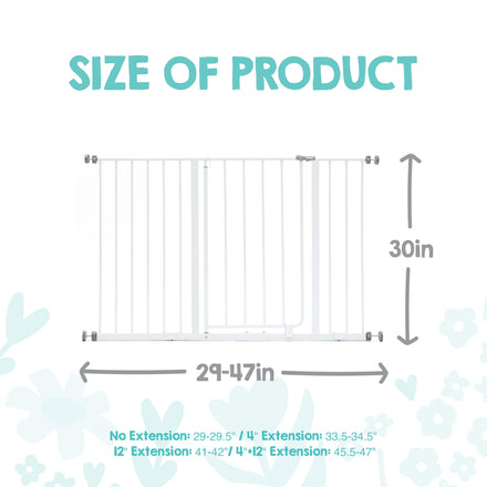 - 🔒47” EXTRA WIDE BABY GATE FOR DOORWAYS & BOTTOM OF STAIRS: Expands to fit openings between 29–47 inches wide, making it ideal as a baby gate for bottom of stairs, hallways, and wide doorways. Fits: 29–29.5" (no extension) | 33.5–34.5" (with 4" extension) | 41–42" (with 12" extension) | 45.5–47" (with 4" + 12" extensions).