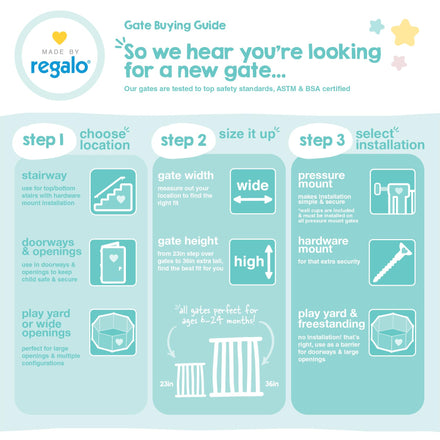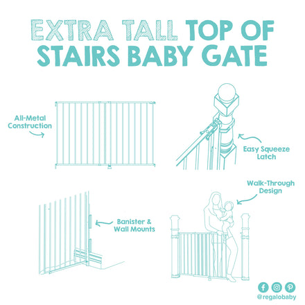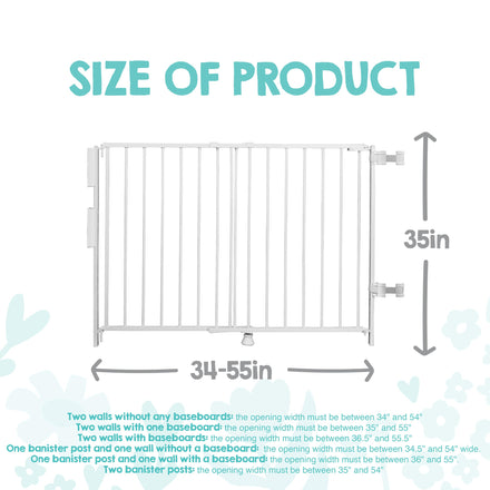 • EXTRA TALL BABY GATE FOR STAIRS & HALLWAYS: Expands to fit stairways and openings between 34”–55” wide and stands 35” tall. Ideal for top or bottom of stairs. Please measure your opening prior to purchase to ensure proper fit.