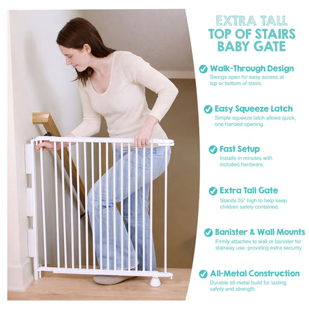 Regalo Safety 35" Extra Tall Baby Gate for Stairs, Wall Mounted 2-in-1 Wide Stair Gate for Babies, Toddlers, & Pets, Includes Banister and Wall Mounting Kit, White