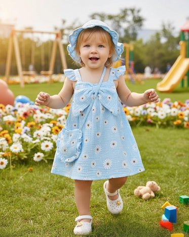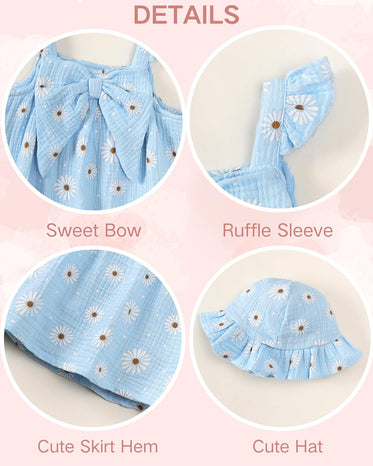 • Adorable Design with Bowknot: This toddler girl dress features charming ruffle sleeves and an oversized bow that adds adorable and sweet touch. The sleeveless design of this baby girl outfits keeps your little baby cool during spring and summer warm days. Comes with a matching hat for sun protection and a cute little bag to complete the cute look.