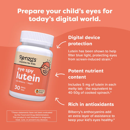 Renzo's Eye Spy Lutein with Bilberry Extract, Dissolvable Kids Vitamins for Eye Health, Sugar-Free Supplements, 30 Orange-Flavored Melty Tabs