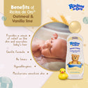 Details: Ricitos de Oro Oatmeal and Vanilla is a hair and body shampoo to pamper your baby. It is a product made to help moisturize and soften your baby's sensitive skin all day long, using its natural Oatmeal and Vanilla ingredients.