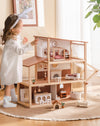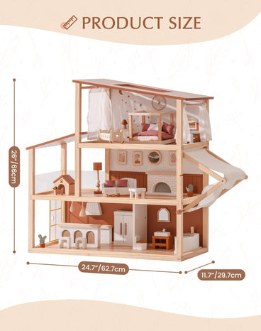 • Bohemian Style & Customizable Rooms: This dollhouse’s 3-story design embraces Bohemian charm. Kids can rearrange furniture in rooms like the living area, kitchen, bedroom, and bathroom, sparking endless playtime scenarios and imaginative interior design.