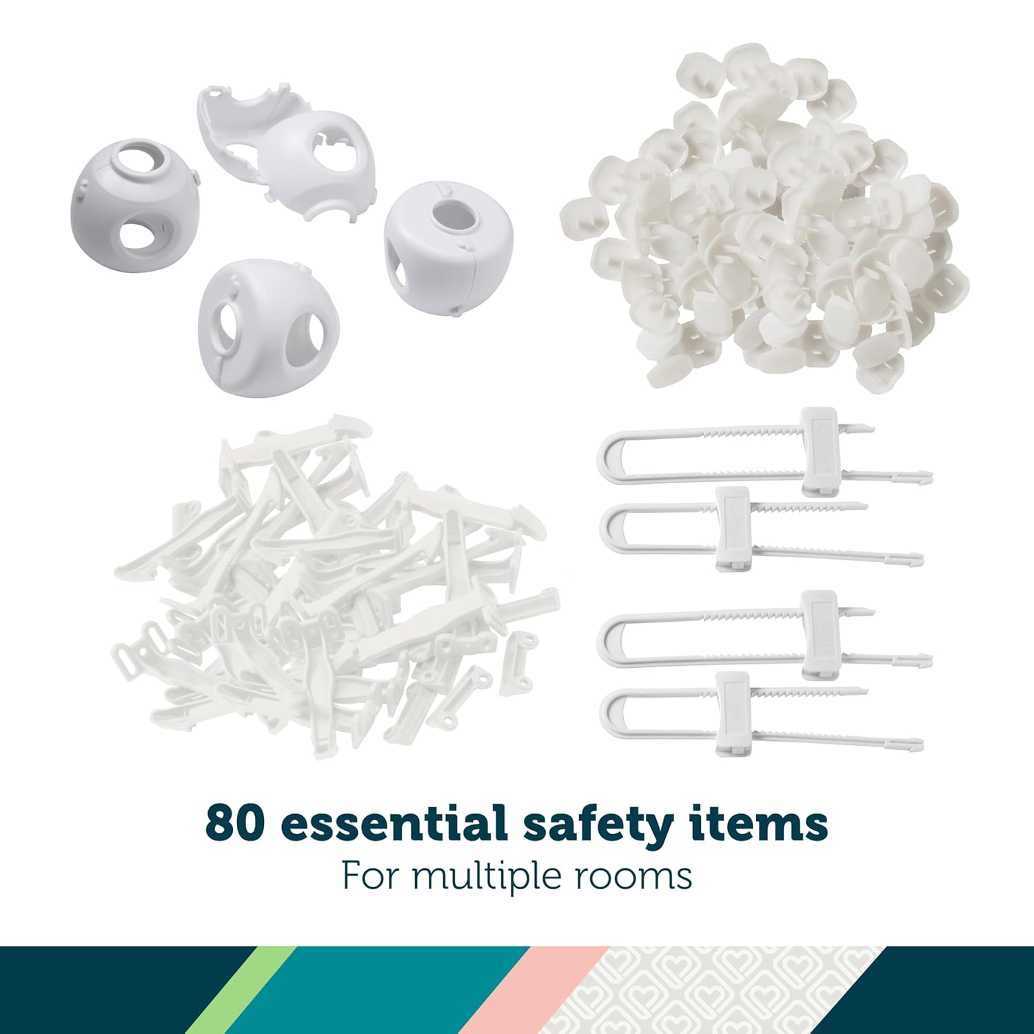 The Home Safeguarding Set by Safety 1st makes it simple to include safety in your plans when preparing the nursery and other rooms of your home for your new baby. These 80 essential safety items will help you make things safer for your new bundle of joy. The set includes 40 plug protectors, 6 Grip 'n Twist Door Knob covers, 30 Cabinet & Drawer Latches, and 4 Cabinet Slide Locks to help you secure multiple rooms in your home.Outlets are close to the floor and easy for curious children to reach. Installing Plug Protectors helps prevent young children from accessing unused outlets, with a smooth, non-grip design and opaque color that goes unnoticed by children.Some rooms need to be completely out of bounds to little explorers. Grip 'n Twist Door Knob Covers allow parents easy access to the door knob, but stop young children from entering the room. The covers are easily assembled around your door knob; simply click the two halves together by aligning the interlocking tabs. To use, grab the door knob through the holes in the cover and turn.Cabinets contain cookies, snacks, and other food that children shouldn’t have easy access to. Install Latches on cabinets or drawers and use Cabinet Slide Locks on cabinets that are side by side. These devices help keep curious children from getting inside.Remember, safeguarding the home early will help make things easier for the whole family as your child grows. Begin by preparing the nursery before baby arrives; and the kitchen, bathroom, and other common areas before your baby starts crawling.