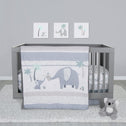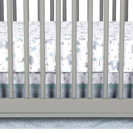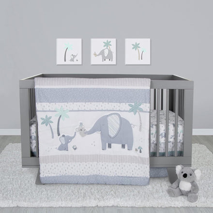 • This baby bedding set includes a gender-neutral quilt crib comforter, fitted crib sheet, crib skirt, and a plush toy