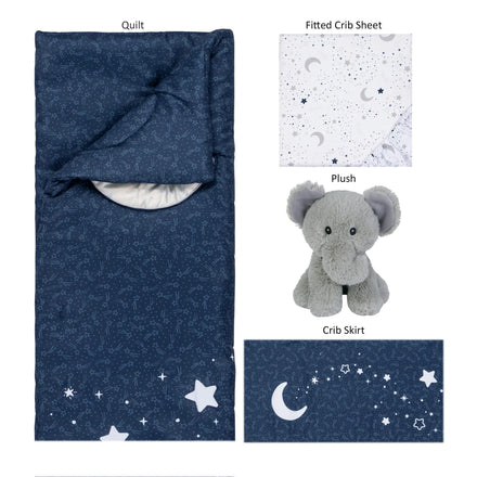 • This baby bedding set includes a gender-neutral quilt crib comforter, fitted crib sheet, crib skirt, and a plush toy