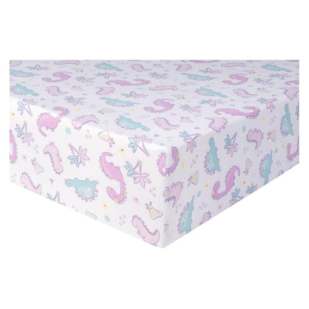 • This baby girl crib bedding set features three smiling dinosaurs surrounded by footprints, a volcano and printed flowers