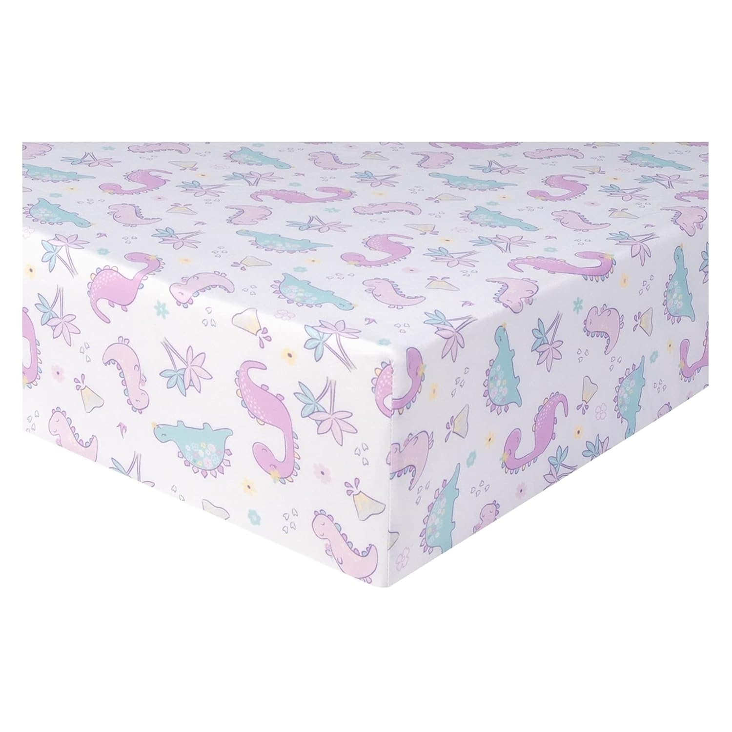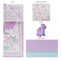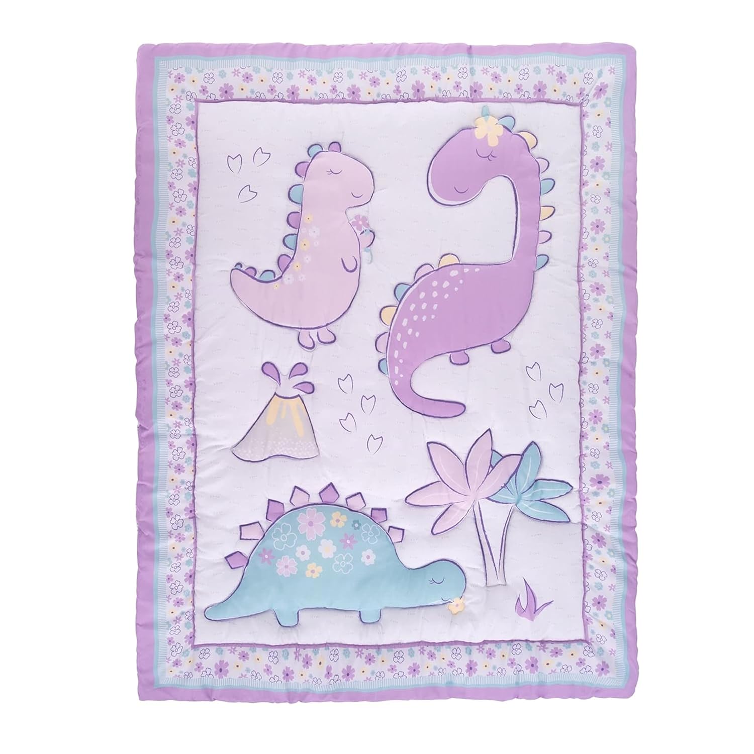 This baby girl crib bedding set features three smiling dinosaurs surrounded by footprints, a volcano and printed flowers