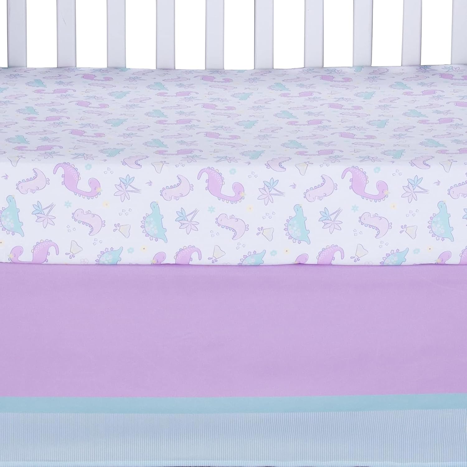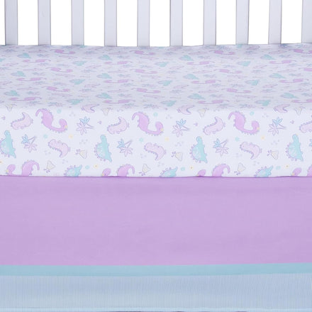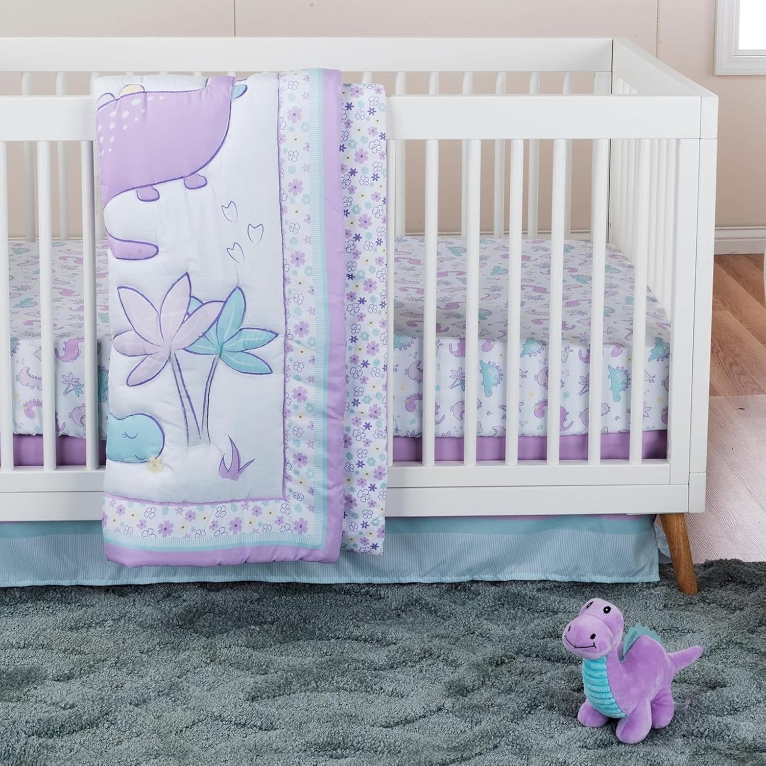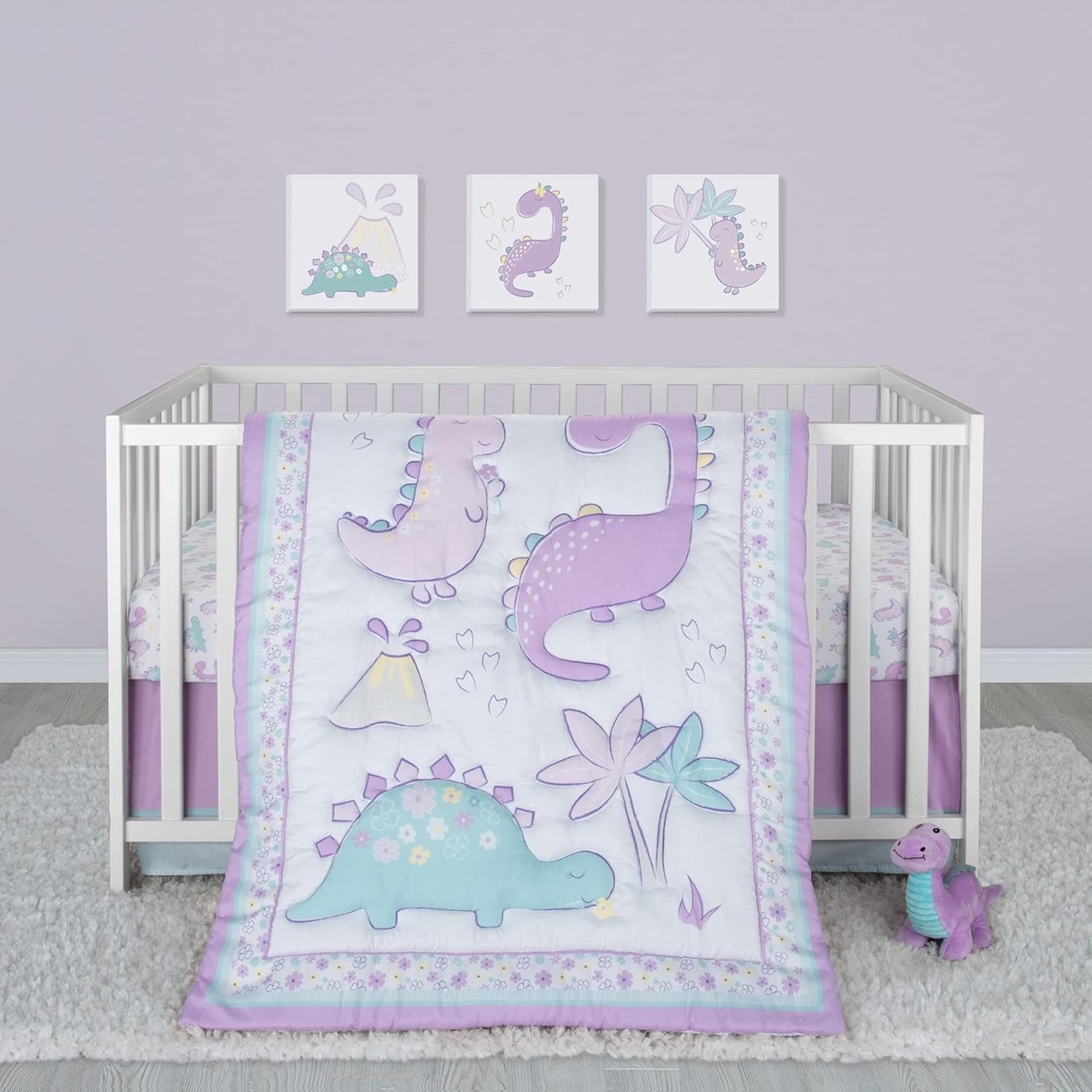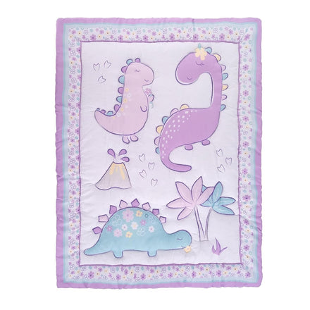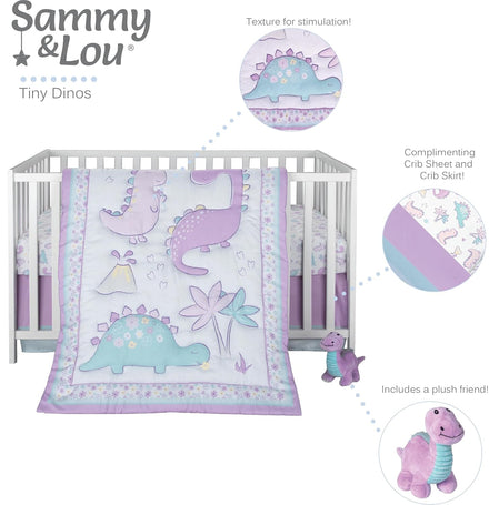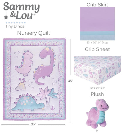 Sammy & Lou Tiny Dinos 4-Piece Baby Nursery Crib Bedding Set for Girls, Includes Quilt, Fitted Crib Sheet, Crib Skirt, and Plush Toy