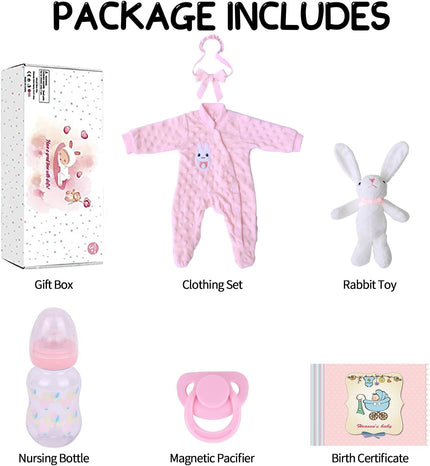 • Luxury Gift Box: Welcome your new baby Lucy! In addition, now the set includes 1 set of pink clothing, 1 rabbit doll, 1 magnetic pacifier, 1 feeding bottle, 1 birth certificate and 1 gift box, all in one package