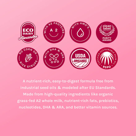 • NUTRIENT RICH FATS: Modeled after human milk, our toddler milk formula has eight sources of healthy fats, such as A2 organic whole milk powder, olive oil, and coconut oil. We skip the industrial oils to give your baby the best nutrition