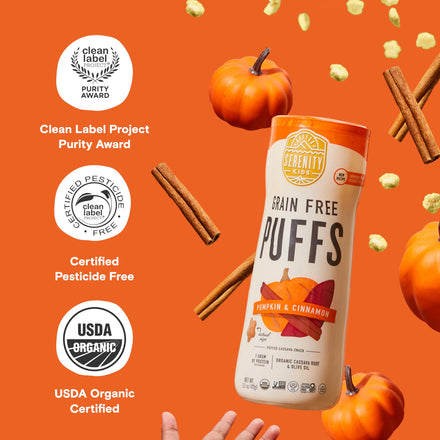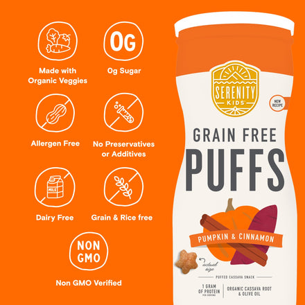 Serenity Kids 6+ Months Grain Free Puffs Toddler & Baby Snack | No Added Sugar, Gluten & Rice Free, Allergen Free | Made with Organic Cassava, Veggies, and Herbs | Pumpkin & Cinnamon | 1 Count