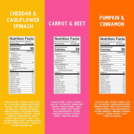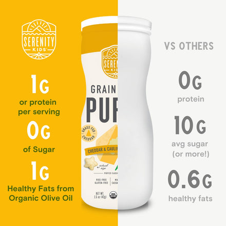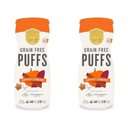 Introducing Serenity Kids' Grain Free Puffs, the perfect snack option for your little ones! These baby puffs are designed for kids 6 months and older, offering a tasty and nutritious treat without any added sugar. Packed with organic cassava, veggies, and herbs, these organic puffs are all about real food goodness. Your baby or toddler can enjoy these baby puffs snacks guilt-free, knowing they're munching on something that's made with love and care. When it comes to toddler snacks, Serenity Kids Puffs stand out with their unique benefits. They're not another baby cereal or baby rice cereal; they're loaded with complex carbs like cassava that naturally support gut health. Plus, with the inclusion of organic olive oil, these organic baby puffs provide healthy fats, making them a wholesome choice for your little one's snacking adventures. We know that finding the right baby snacks can be a challenge, but these organic baby snack puffs solve that problem effortlessly. They're free from common allergens and heavy metals often found in other puff baby snacks, ensuring your child's safety. With flavors like carrot, pumpkin, and white cheddar, your child will love every bite. These puff baby snacks come in a convenient 1.5-ounce pack of 6, perfect for on-the-go munching. Just remember to finish them within 5-7 days of opening for maximum freshness. So, let your child enjoy these delightful organic toddler snacks and make snack time a breeze!