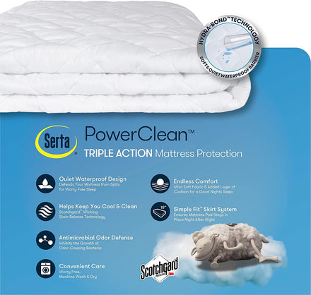 Details: A good night's sleep begins with a bed that is comfy and clean. Keep your bed comfy, clean, and get a good night's sleep with the Serta Power Clean Waterproof Triple Action Mattress Pad.
