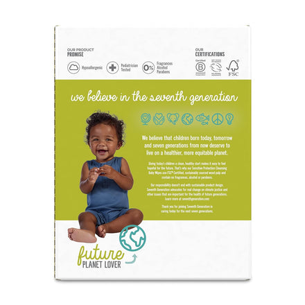 Smooth, soft, and clean the way a baby's bottom should be. Seventh Generation Free & Clear Baby Wipes are made for baby's sensitive skin and contain 0 percent fragrance, alcohol, parabens, or Phenoxyethanol. Our thick, soft wipes are strong enough for big messes while being gentle on newborn baby's most precious, delicate skin. These baby wipes are moistened with plant derived skin conditioners like Aloe Vera and are safe for baby, hands, and face. The flip top package design locks in moisture to keep wet wipes fresh and allow for easy, on the go are dispensing. Our hypoallergenic and fragrance free wipes are dermatologist tested and clinically proven to be gentle on baby's skin. It's all good, baby. Caring for a little human is a magical undertaking, and we've developed an entire line of baby skin care products, wipes, and diapers to bring peace of mind for your journey. For every life changing milestone, you deserve baby care you can trust. Disposal Safety: Please dispose of used wipes in trash receptacle. Do not flush.