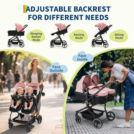 • Convenient Features for Parents: Switch your babies to face inside or outside at any time. With the double jogging stroller's backrest angle regulator and seat angle buttons, you can quickly adjust settings for a relaxing, tailored ride on every journey