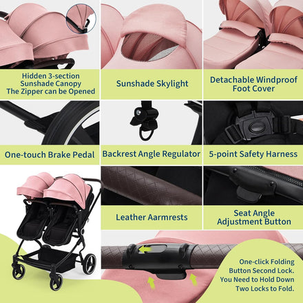 • Safety and Style Combined: This foldable double stroller includes a 5-point safety harness, leather armrests, and a one-touch brake pedal for peace of mind. The high landscape design keeps children away from car exhaust while elevating their view