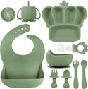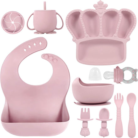 • 10 PCS SILICONE BABY FEEDING SET - Our baby weaning set for baby comes with everything your baby need to transition to self feeding. The newborn essentials must haves includes 1 baby suction plate with 5 dividers, 1 suction bowl, 1 silicone bibs with food catcher, 1 sippy cup with straw and lid, 1 snack toddler cups lid, 1 spoon, 1 fork, 1 baby spoon, 1 baby fork and 1 baby fruit food feeder pacifier. The baby feeding supplies baby stuff baby boy essentials newborn essentials toddler plates