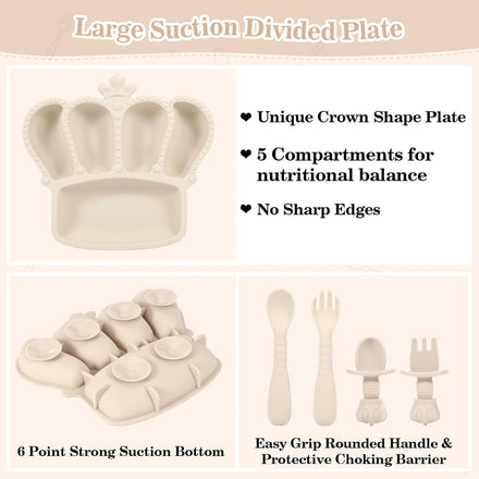 • DIVIDED CROWN SHAPED SUCTION TODDLER PLATE - We adopted food grade silicone. This unique crown shaped plate featuring 5 divided sections with non-slip 6 suction points design will ensure the plate stays still during mealtime. This baby girl newborn essentials plates and bowls sets can withstand high heat making the kids plates baby feeding essentials toddler utensils baby necessities suitable for microwave use and can be cleaned in the dishwasher