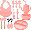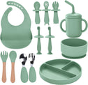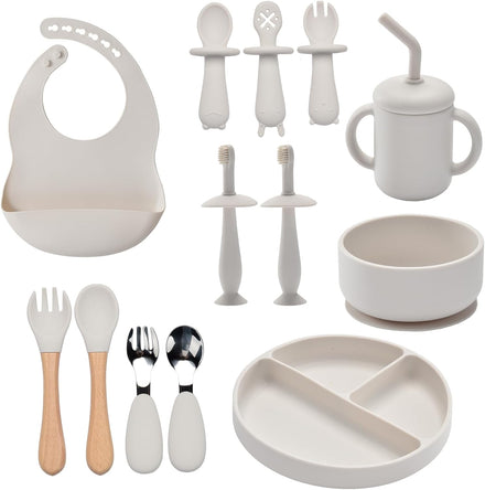 • 【13PCS Baby Utensils】baby feeding set includes: 1x suction plates for baby, 1x Baby Bowl, 1x Baby Cup, 1x Bib, 2x Silicone Fork & Spoon, 2x Stainless Steel Fork & Spoon, 3x First Stage Feeding Spoons,, 2x Baby Toothbrushs.