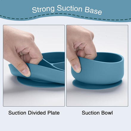 • 【Suction Plate & Bowl】 Designed to make mealtime easier and less messy.These baby plates have three divisions and the bottom suction cup design attaches securely to a flat surface, preventing the toddler plate from being thrown or tipped over. The dividers help to separate food and the raised edges make it easier for baby to scoop food from the plate.