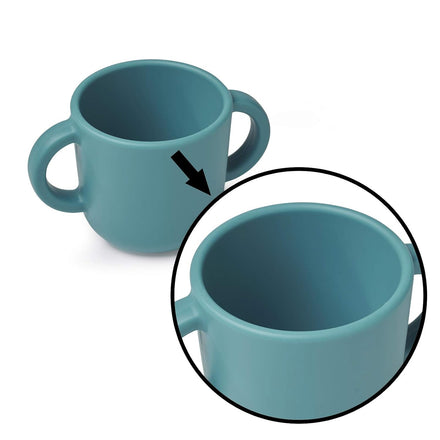 Designed for little hands Quality: 100% silicone. Dimensions: Height 2.7 in/ Diameter 2.5in / Volume: 5oz Transitions Baby from Bottle to Cup Training cup with handles make the transition much easier from a bottle to an open cup. A really nice drinking cup made of 100% BPA free silicone. Tested according to the latest US regulations. The Tiny Cup is unbreakable, lightweight and perfect for dinners out and travel. Suitable for a toddler to carry around filled with Snacks. Simply give the kids cup a quick rinse with hot water or put it in the dishwasher. Please wash with hot-soapy water before the first use.