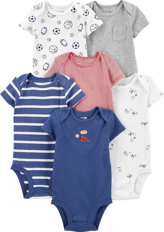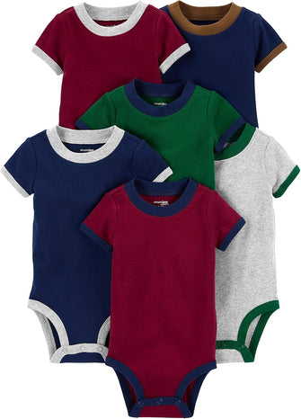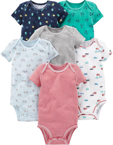 Simplify dressing your baby boy with this 6-pack of short-sleeve bodysuits from Simple Joys by Carter's. Each bodysuit features expandable shoulders that make it easy to slip over your baby’s head, while the strong, nickel-free snaps ensure quick and hassle-free diaper changes. Made from 100% soft and breathable cotton, these bodysuits are gentle on your baby's skin and perfect for everyday wear. The tagless design eliminates irritation, keeping your baby comfortable all day long. With OEKO-TEX Standard 100 certification, you can trust that these bodysuits are safe and free from harmful substances. Available in a convenient 6-pack, these bodysuits provide exceptional value and are designed to mix and match easily with any outfit. Simple Joys by Carter's delivers high-quality, stylish clothing at affordable prices, making this 6-pack a smart choice for parents looking for both quality and value.