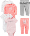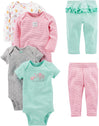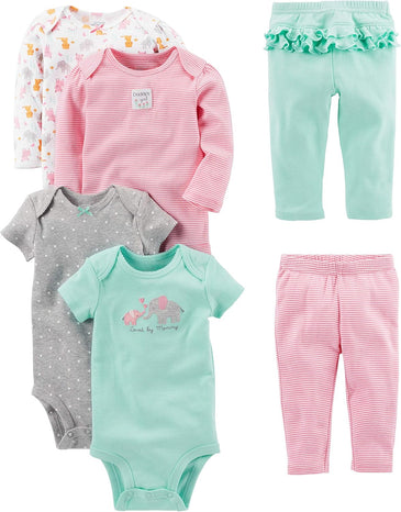 • 6-piece clothing set: Includes 2 short sleeve bodysuits, 2 long sleeve bodysuits, and 2 pair of pants.