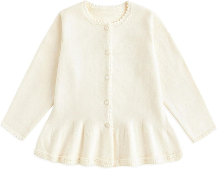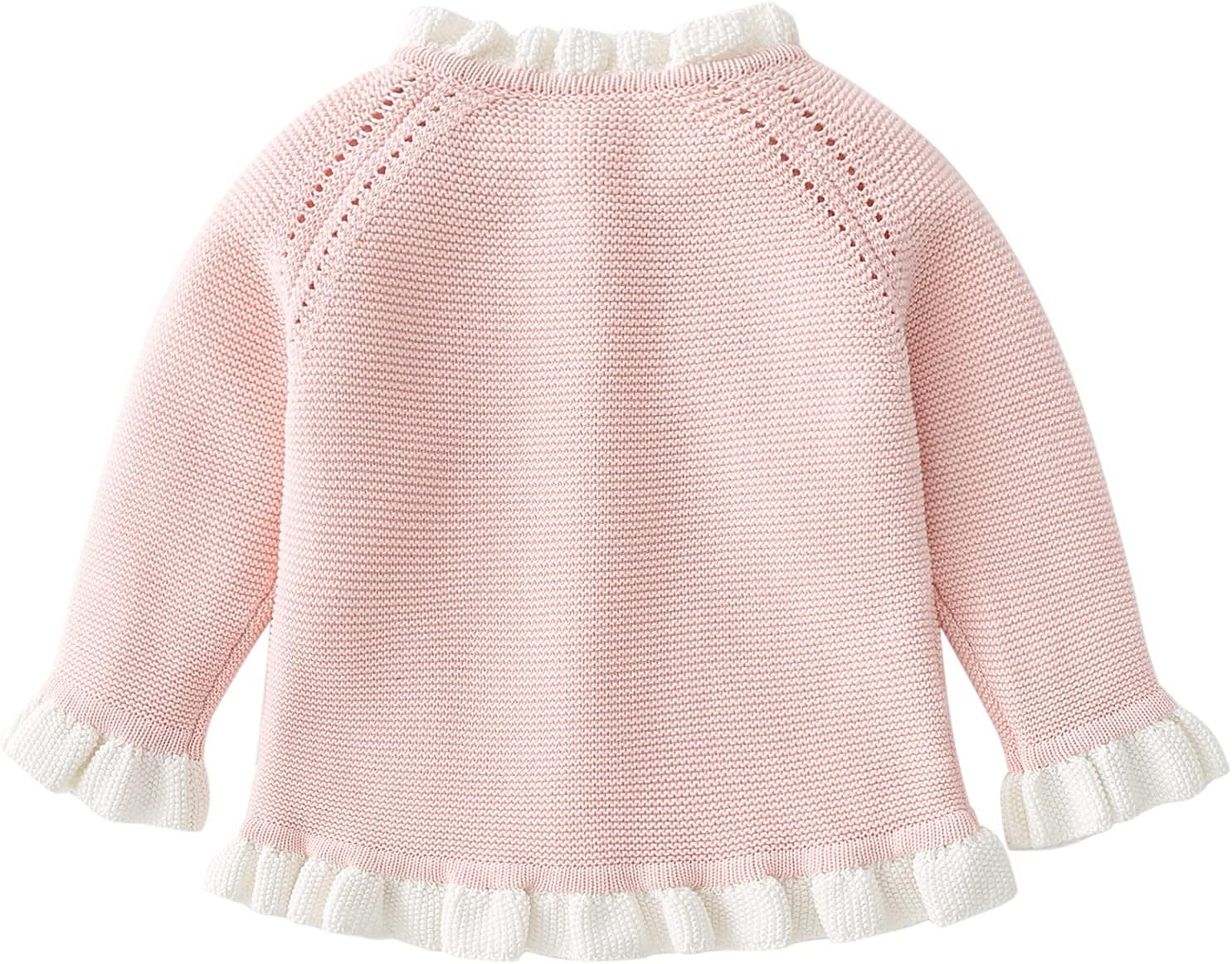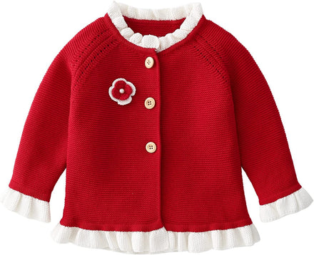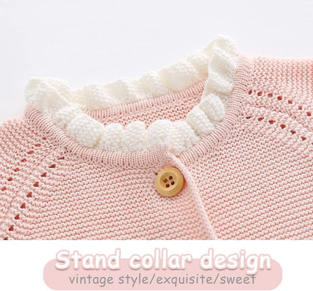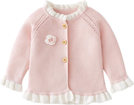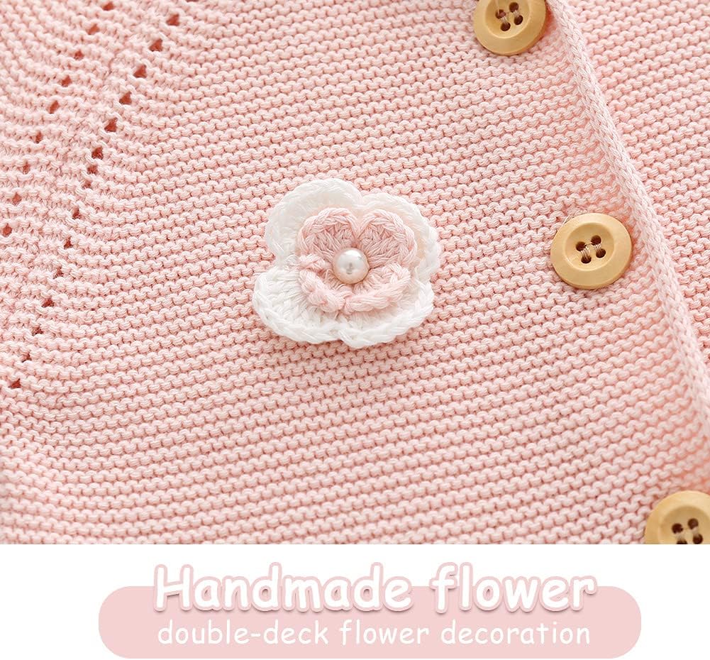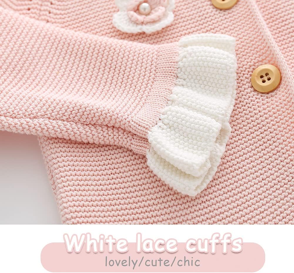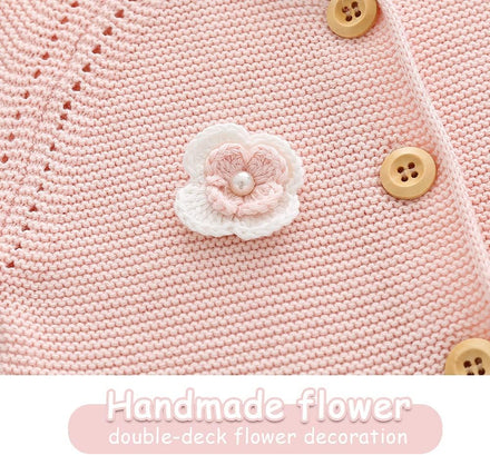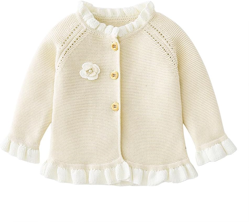 • 🌸Design- Classic knitting design,cutest Ruffle design on cuffs and hem/ hand-crocheted flowers design,Button design makes the sweater coat easier for baby to wear.