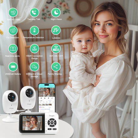 Simyke 1080p Smart 2Camera Video BabyMonitor,Wifi On/Off Switch,2.8" inch Display or WiFi Remote Access,NightVision,1500ft Long Range,2-Way Talk,Sound Alert,Temperature Sensor,Lullabies Feeding Remind