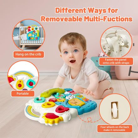 • A Box of Music and Early Education Enlightenment: The Activity Panel is equipped with various functions. More than 80 sounds can be spotted when playing the panel, including nursery rhymes, instrument sounds, animal sounds, drum rhythms, 26 alphabet songs etc. Kids will get interesting sounds when pulling out the ABC letters, or picking up the phone, or turning the gear. All these activities will help to develop their fine motor skills and hand-eye coordination. The soft light will definitely attract kids’ eyes and make them feel happy