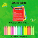 • WHAT'S INSIDE: 18 Colorful Chalk Sticks & 15 Waterproof Activity Cards