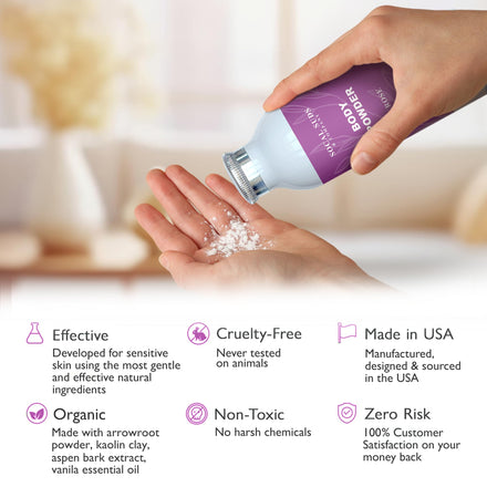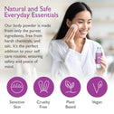 • VEGAN VIRTUE, EARTHLY EMBRACE: Our products represent a deep commitment to natural integrity, quality, and the standards of safety. With every bottle, we make a vow of purity and responsibility not just to our consumers but to the environment as well. Built on vegan principles, we ensure our formulations are gentle on the skin and kind to the planet, embodying our dedication to making a positive impact with every use. Our natural body powder ensures this commitment.